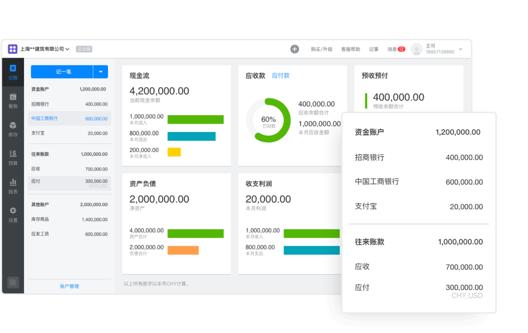 好在朋友给我推荐了账王,它自带应收应付功能,应收账款分析、预警体制,通过录入过的数据一键生成财务报表和凭证,方便核算运营生产利润。